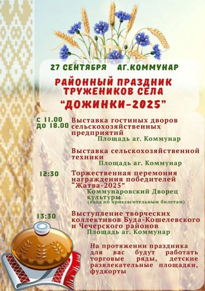 Домой Анонс 27 сентября в аг. Коммунар пройдет районный праздник тружеников села «Дожинки-2025» АнонсОбществоСельское хозяйство 27 сентября в аг. Коммунар пройдет районный праздник тружеников села «Дожинки-2025» По Авангард - 24.09.2025 406 0