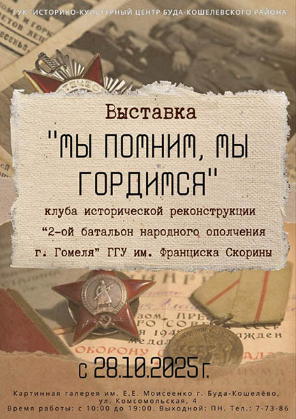 Домой Анонс С 28 октября начинает работать выставка «Мы помним, мы гордимся» АнонсКультурные события и мероприятияНаша памятьОбщество С 28 октября начинает работать выставка «Мы помним, мы гордимся» По Авангард - 24.10.2025 133 0
