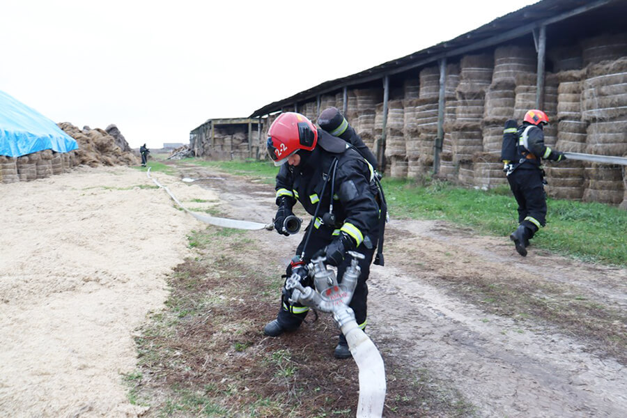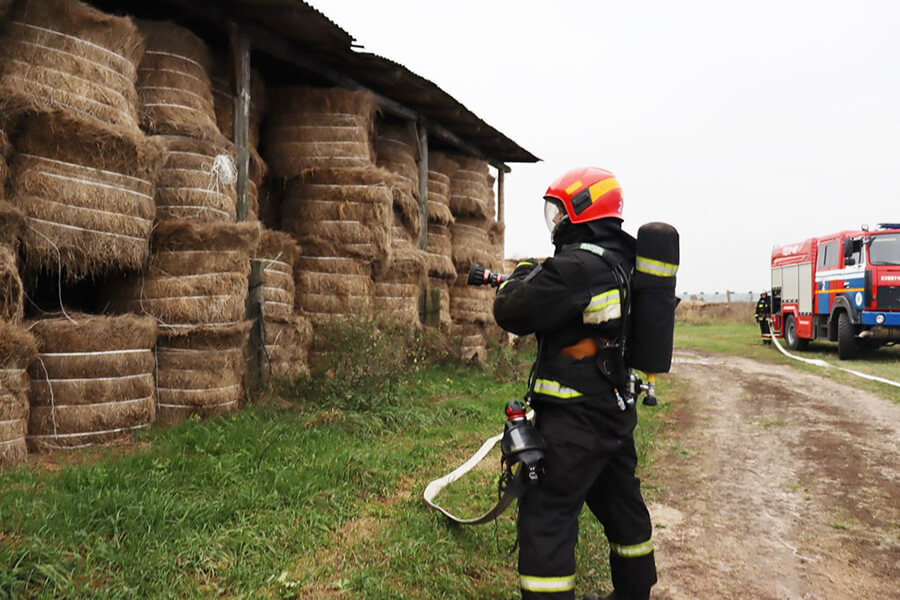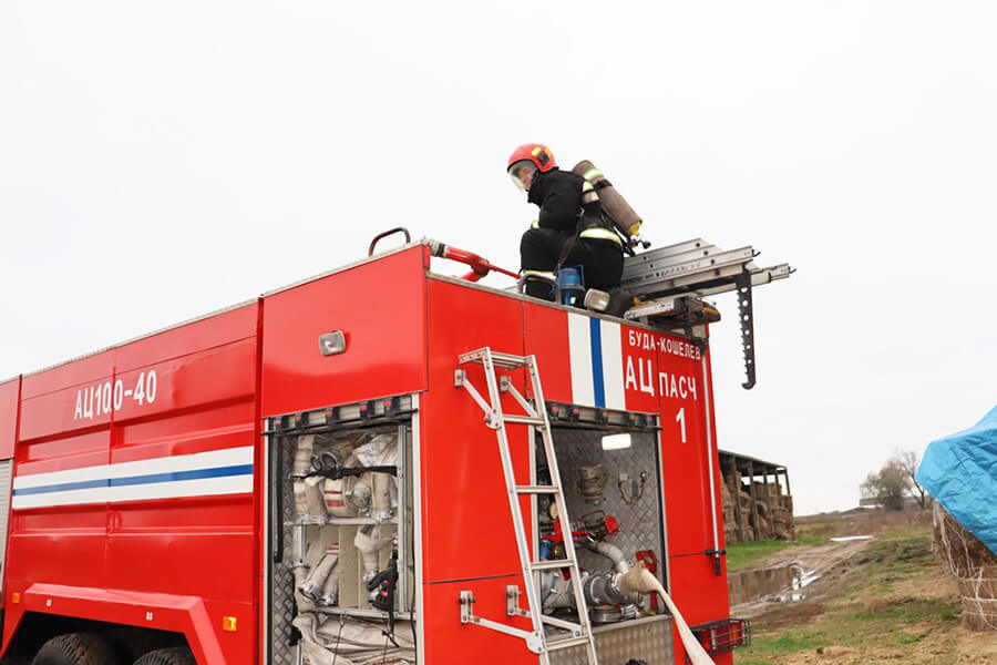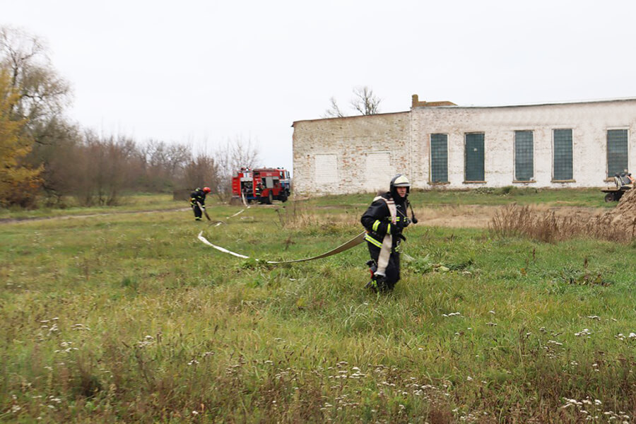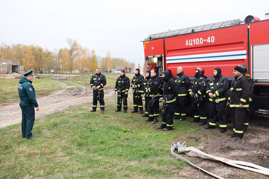 По легенде учений, произошло возгорание шохи для хранения льнотресты. Спасатели оперативно прибыли на место ЧС и грамотно ликвидировали условный пожар.