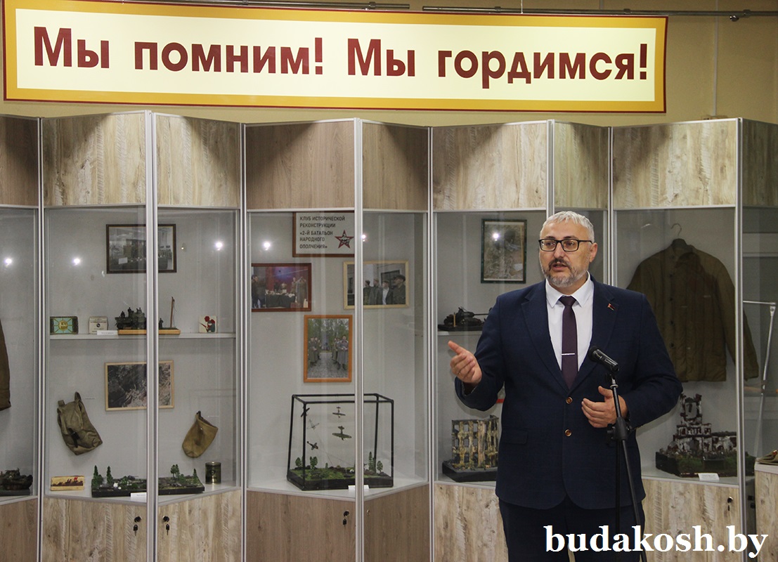 Ее инициатором является историко-культурный центр. Выставка проводится в рамках 80-летия победы советского народа в Великой Отечественной войне. Прокурор района Андрей Комаров подчеркнул, что подобные мероприятия, напоминая о событиях, происходивших в годы Великой Отечественной войны на территории Беларуси, помогают привить молодежи любовь к Родине, чувство патриотизма. Все это позволяет приобрести нашей стране прочный фундамент, который поможет устоять в борьбе с навязыванием чуждых нашей стране ценностей.