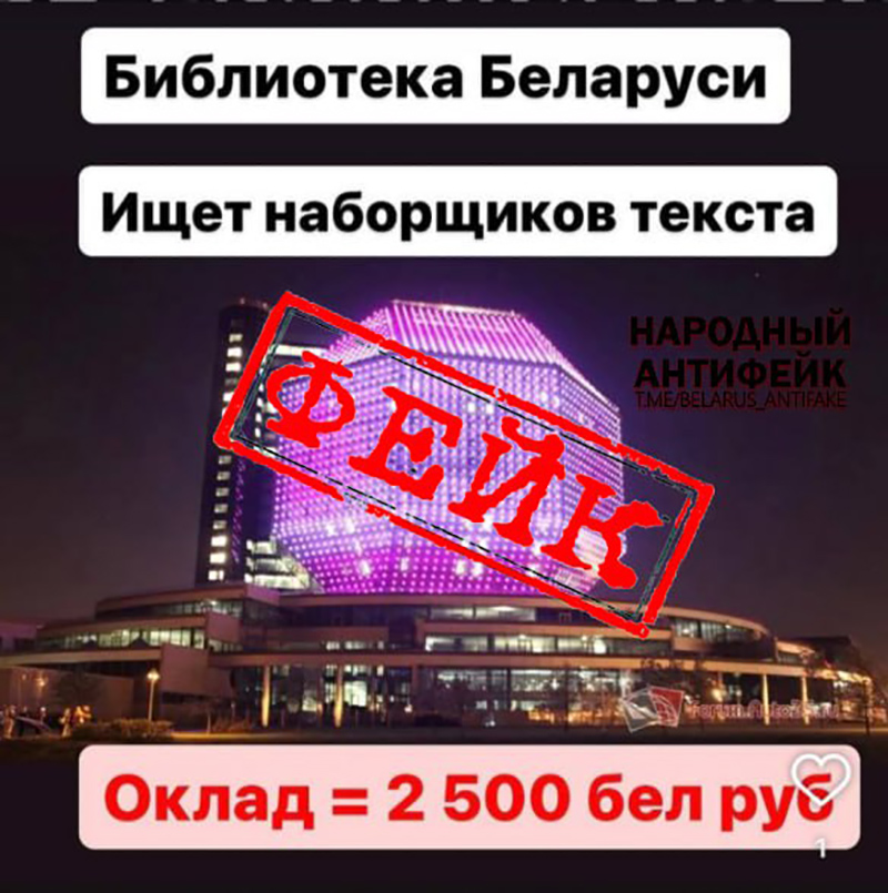 В интернете распространяется объявление с предложением работы якобы от Национальной библиотеки Беларуси. Мошенники предлагают устроиться наборщиком текстов на дому с оплатой от 2500 белорусских рублей в месяц.