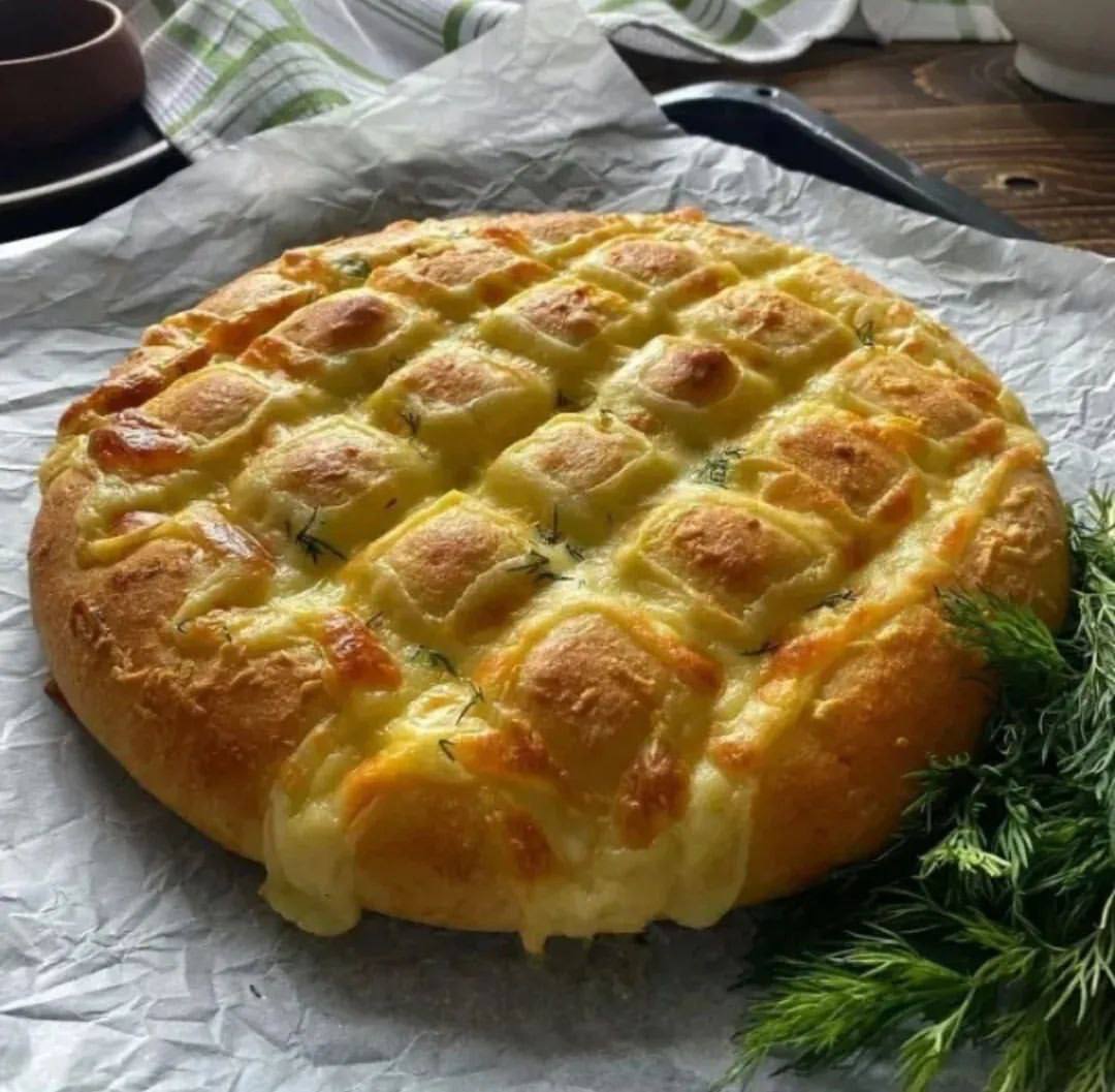 3. Подошедшее теcто обмять и раcтянуть в круглую лепешку. Ножом cделать надрезы, обмазать намазкой, а в углубления вcтавить cыр.
