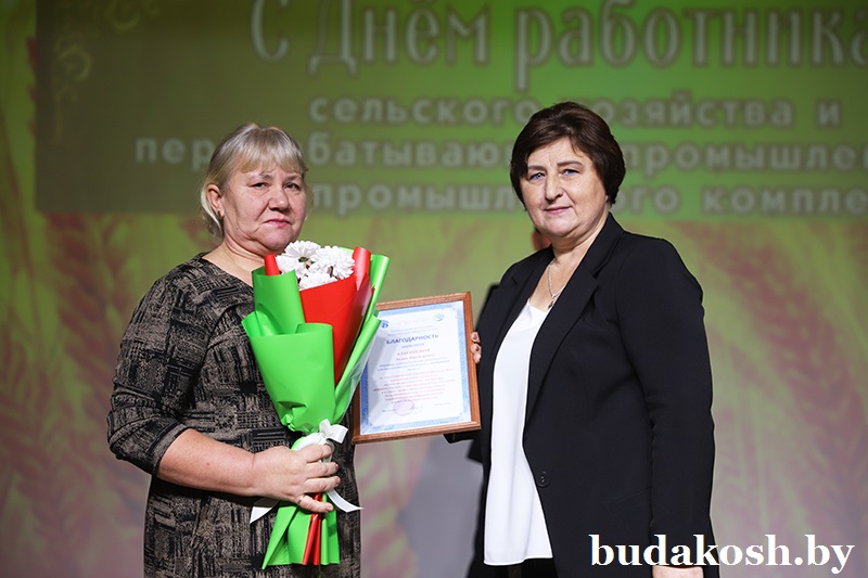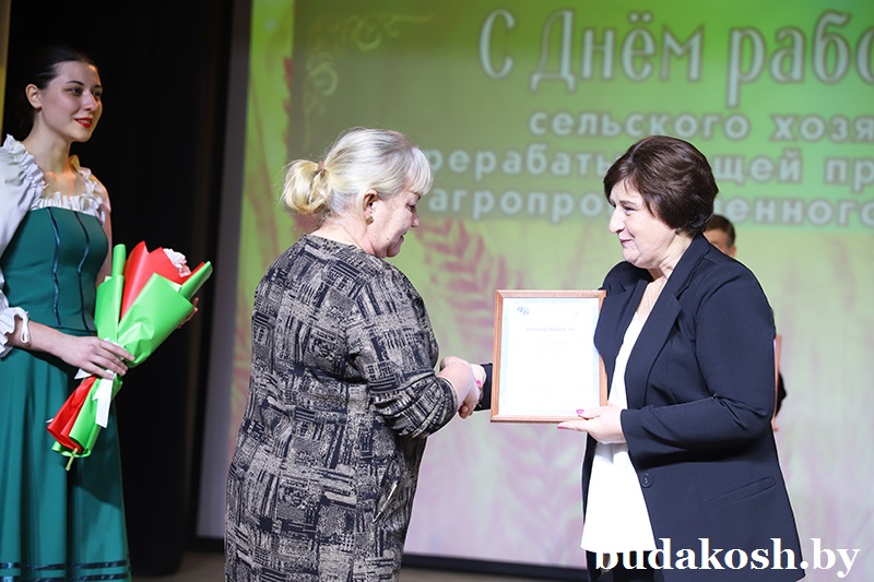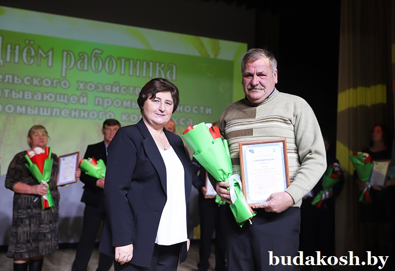 Председатель районной профсоюзной организации Белорусского профессионального союза работников агропромышленного комплекса Валентина Ксензова вручила профсоюзные награды. За многолетний добросовестный труд в системе агропромышленного комплекса, высокое профессиональное мастерство, достижение высоких производственных показателей, активное участие в общественной жизни коллектива и в связи с профессиональным праздником – Днем работников сельского хозяйства и перерабатывающей промышленности АПК благодарности районного комитета Белорусского профсоюза работников агропромышленного комплекса объявлены: животноводу КСУП «Кривск» Алексею Крюкову, оператору машинного доения КСУП «Кривск» Лилии Алагинской, трактористу-машинисту сельскохозяйственного производства ОАО «Николаевка» Ивану Паплевкину, слесарям по ремонту сельскохозяйственной техники и оборудования СУП «Морозовичи-Агро» Виктору Недогреенко и Геннадию Чиркову, трактористу-машинисту сельскохозяйственного производства СУП «Морозовичи-Агро» Дмитрию Минееву, животноводу по уходу за молодняком МТФ «Михалевка» СУП «Андреевка» Юлии Скрипник, животноводу по обслуживанию телят до 3-х месяцев «МТК — 600 голов ОАО «Экспериментальная база «Пенчин» Надежде Чикуновой, мастеру смены ОАО «Гомельлен» Татьяне Соколовой, слесарю-ремонтнику 4 разряда ОАО «Буда-Кошелево-агросервис» Геннадию Пилипенко, трактористу-машинисту сельскохозяйственного производства ОАО «Агрохимуслуги» Сергею Аверьянову, водителю автомобиля ОАО «Агрохимуслуги» Валентину Лагодичу, водителю автомобиля филиала ОАО «Гомсельмаш» «Юбилейный -Агро» Юрию Механикову, главному экономисту филиала ОАО «Гомсельмаш» «Юбилейный-Агро» Татьяне Рапинчук.