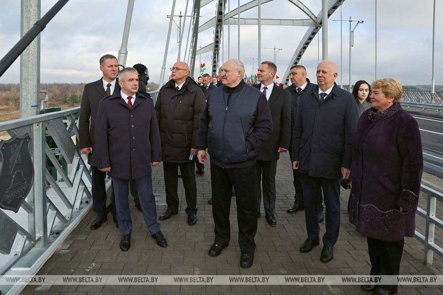Глава государства в торжественной обстановке перерезал символическую красную ленточку. На церемонию были приглашены представители трудовых коллективов дорожных организаций, участвовавших в строительстве моста, жители Мозырского района. По сложившейся традиции ко Дню Октябрьской революции людям преподносят подарки — значимые, масштабные объекты, и обновленный мост — один из них.