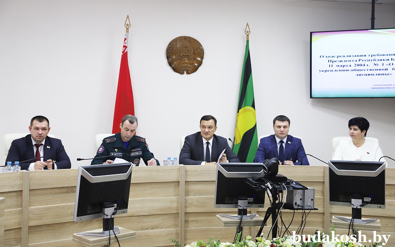 О ходе реализации требований Директивы Президента Республики Беларусь от 11 марта 2004 г. №1 «О мерах по укреплению общественной безопасности и дисциплины» с основным докладом выступила начальник управления по труду, занятости и социальной защите райисполкома Светлана Серафимович. В качестве содокладчиков заслушали начальника районного отдела по чрезвычайным ситуациям Виталия Казачука, начальника отдела внутренних дел райисполкома Александра Мисникова и главного врача центральной районной больницы Станислава Крылатова.