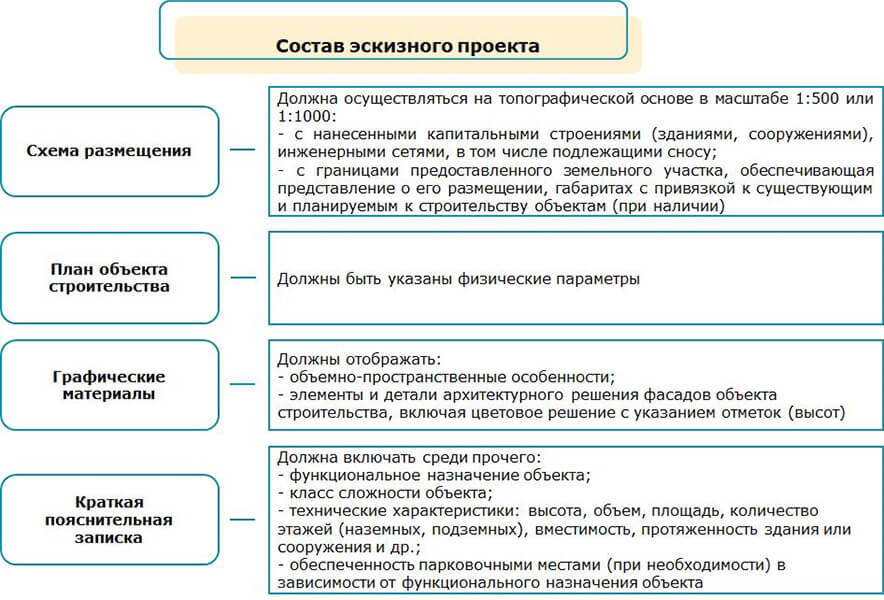— составу эскизного проекта, который включает: схему размещения объекта, план объекта, графические материалы, краткую пояснительную записку.