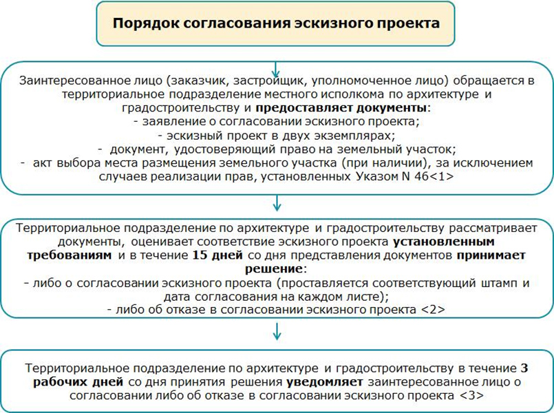 Эскизный проект согласовывается руководителем структурного подразделения местного исполкома базового территориального уровня, который осуществляет государственно-властные полномочия в области архитектурной, градостроительной и строительной деятельности на территории административно-территориальной единицы, включая территории районов в городе по месту нахождения земельного участка (далее — территориальное подразделение по архитектуре и градостроительству) (абз. 3 ч. 1 подп. 1.2 п. 1 Указа №46, абз. 1 ч. 1 п. 3 Положения №242). Порядок такого согласования см. в схеме (п. 3, 4 Положения №242).