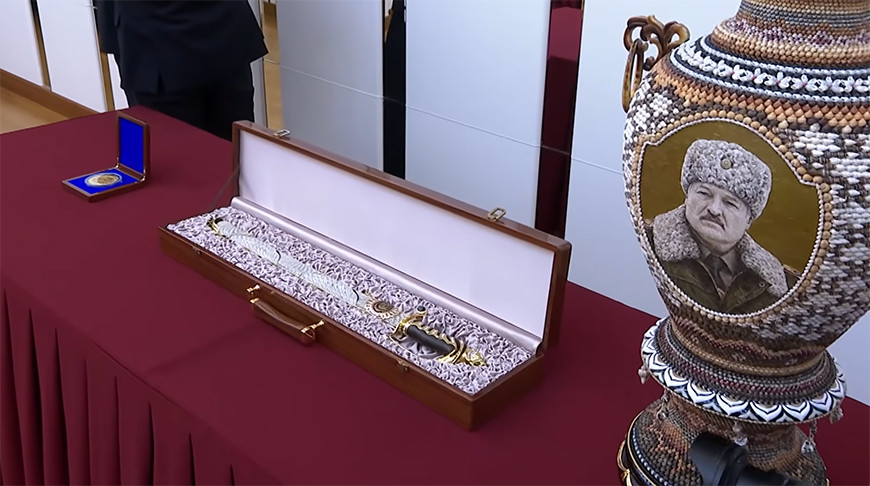 Лидер КНДР передал главе белорусского государства в подарок саблю и большую вазу, декорированную в традиционной для этой страны стилистике с использованием множества разновидностей ракушек, а также сувенирную золотую монету, изготовленную по случаю визита Президента Беларуси в КНДР.