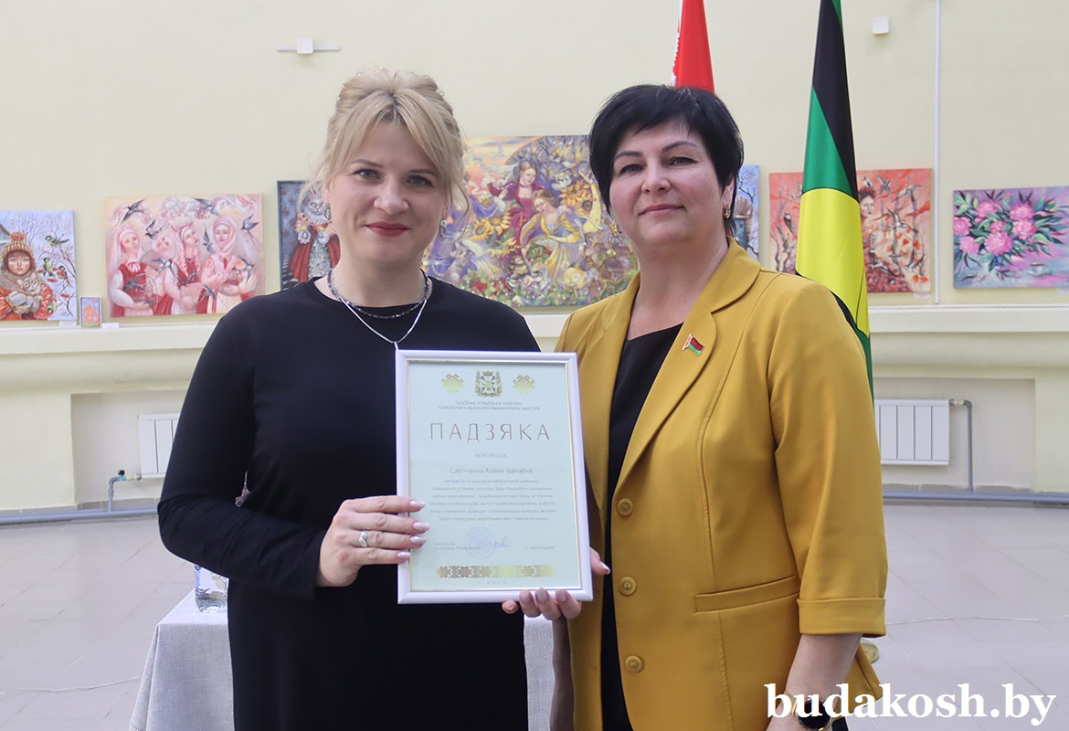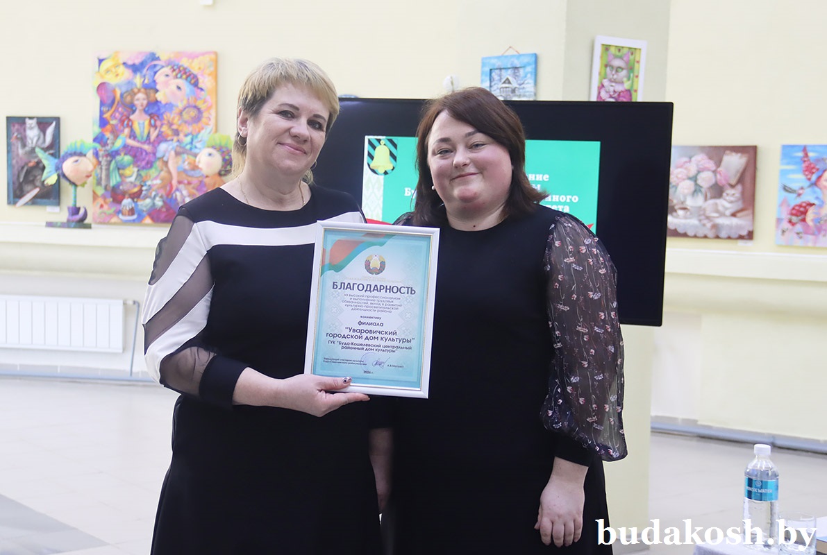 Важной частью мероприятия стала церемония награждения. Благодарность главного управления культуры Гомельского облисполкома за добросовестный труд, эстетическое воспитание населения, высокий профессиональный уровень, особый вклад в сохранение, развитие и популяризацию культуры, активное участие в культурных мероприятиях и общественной жизни региона объявлена методисту по культурно-досуговой деятельности районного Дома культуры Елене Слепченко и заведующей Уваровичской горпоселковой библиотеки Людмиле Журовой.