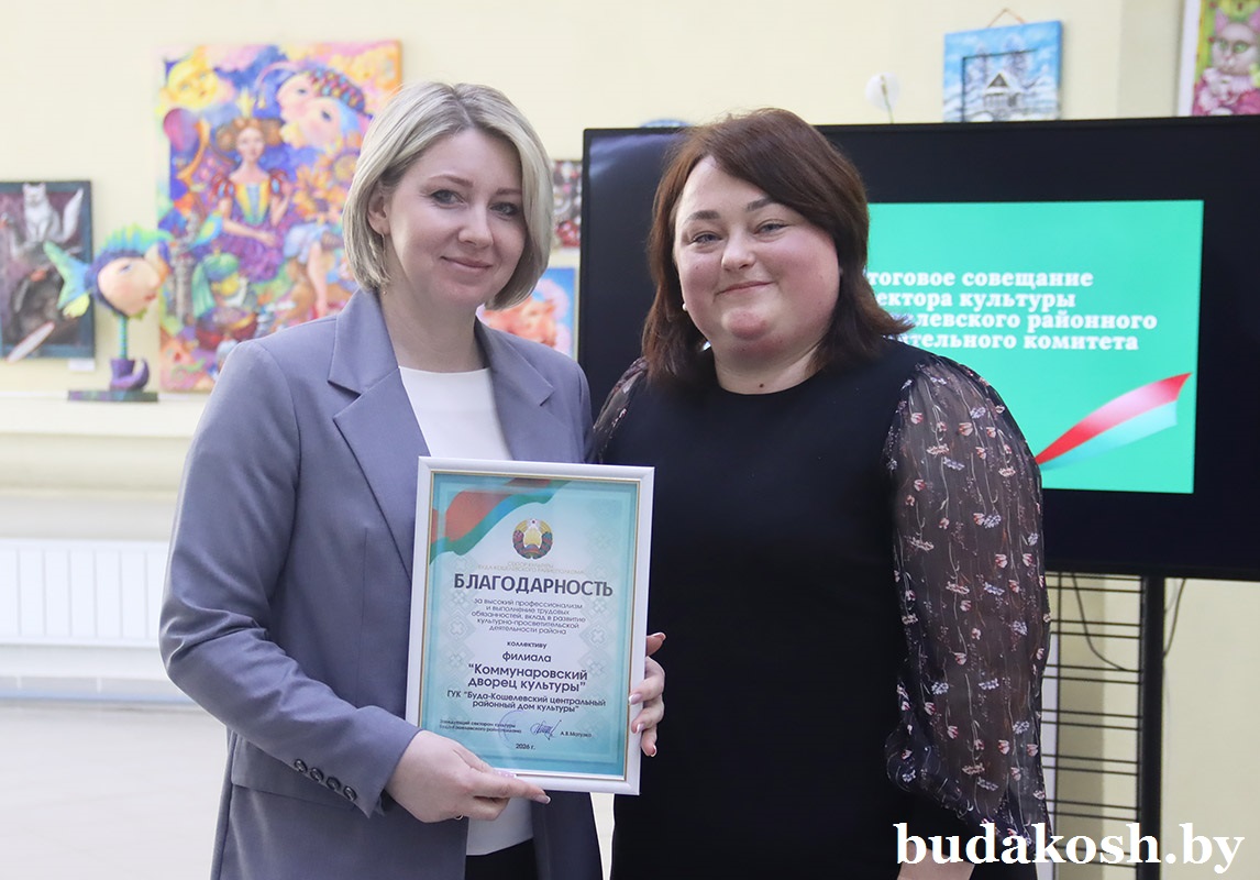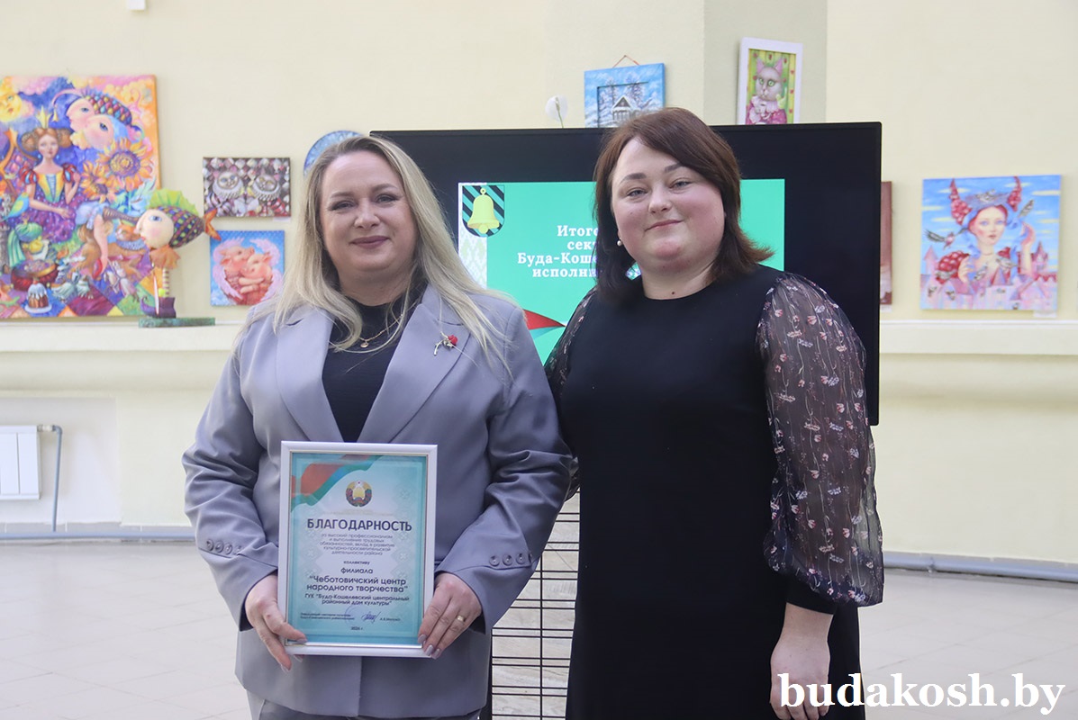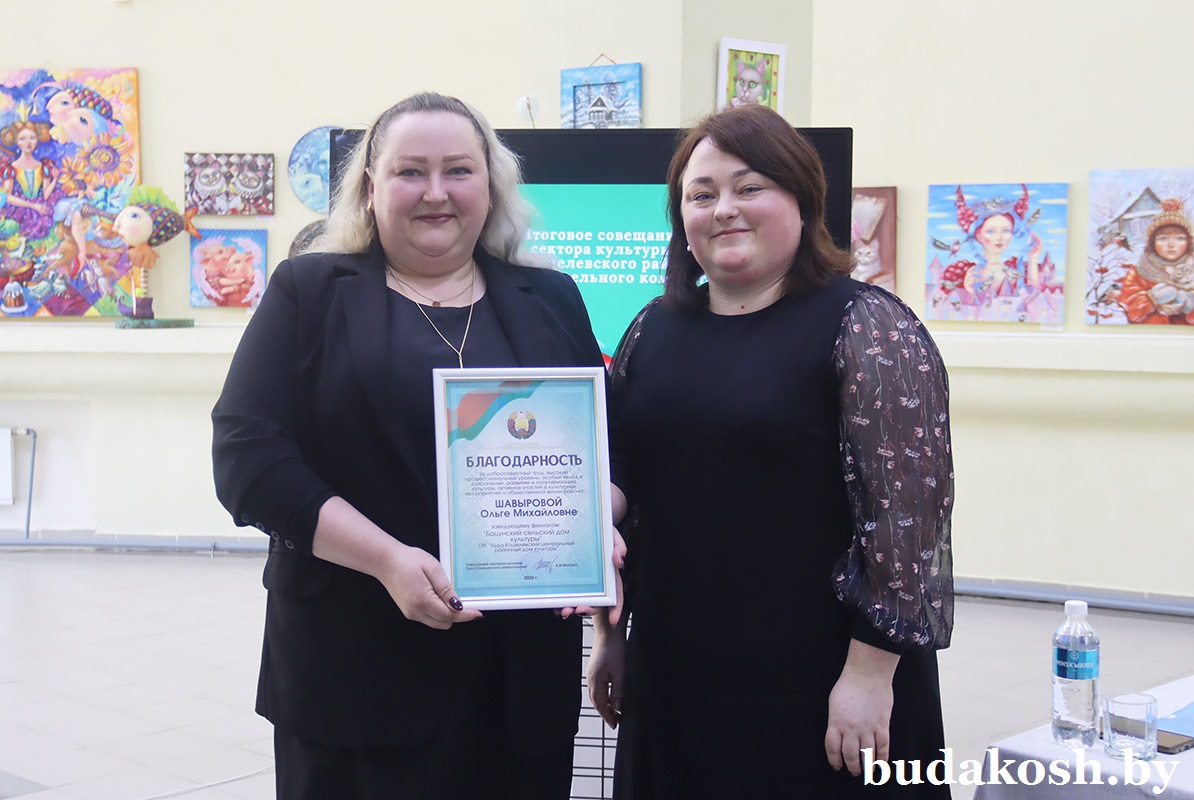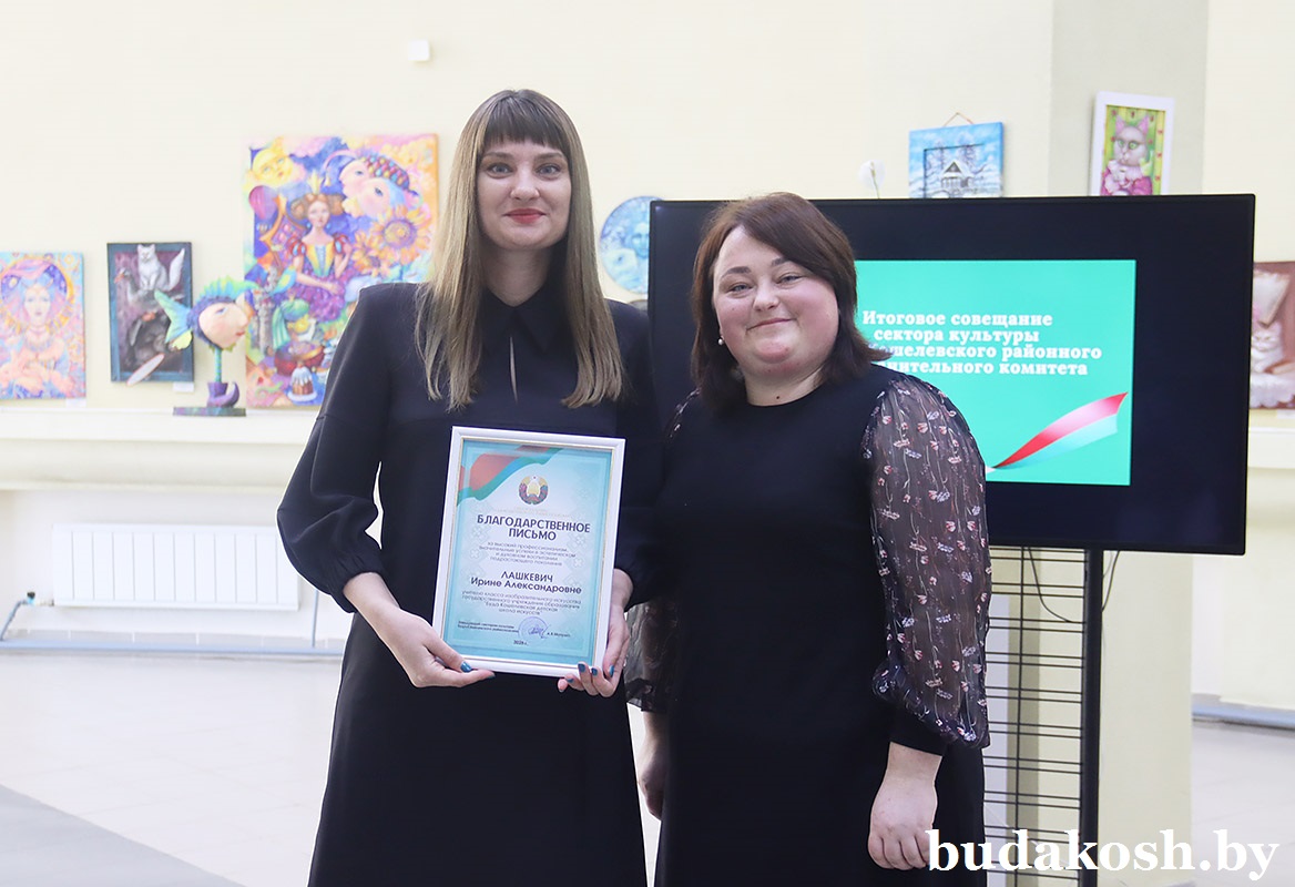 Благодарности сектора культуры объявлены: за добросовестный труд, высокий профессиональный уровень, особый вклад в сохранение, развитие и популяризацию культуры, активное участие в культурных мероприятиях и общественной жизни района – заведующей Бацунским СДК Ольге Шавыровой и культорганизатору Краснознаменского СДК Олесе Мельниковой; за высокий профессионализм и выполнение трудовых обязанностей, вклад в развитие культурно-просветительской деятельности района – коллективам Уваровичского ГДК, Коммунаровского ДК, Чеботовичского ЦНТ и Кривского СДК.