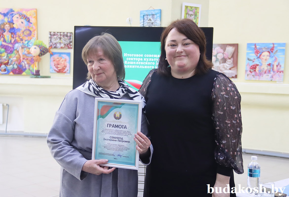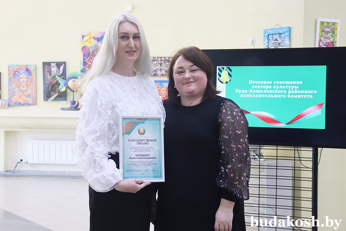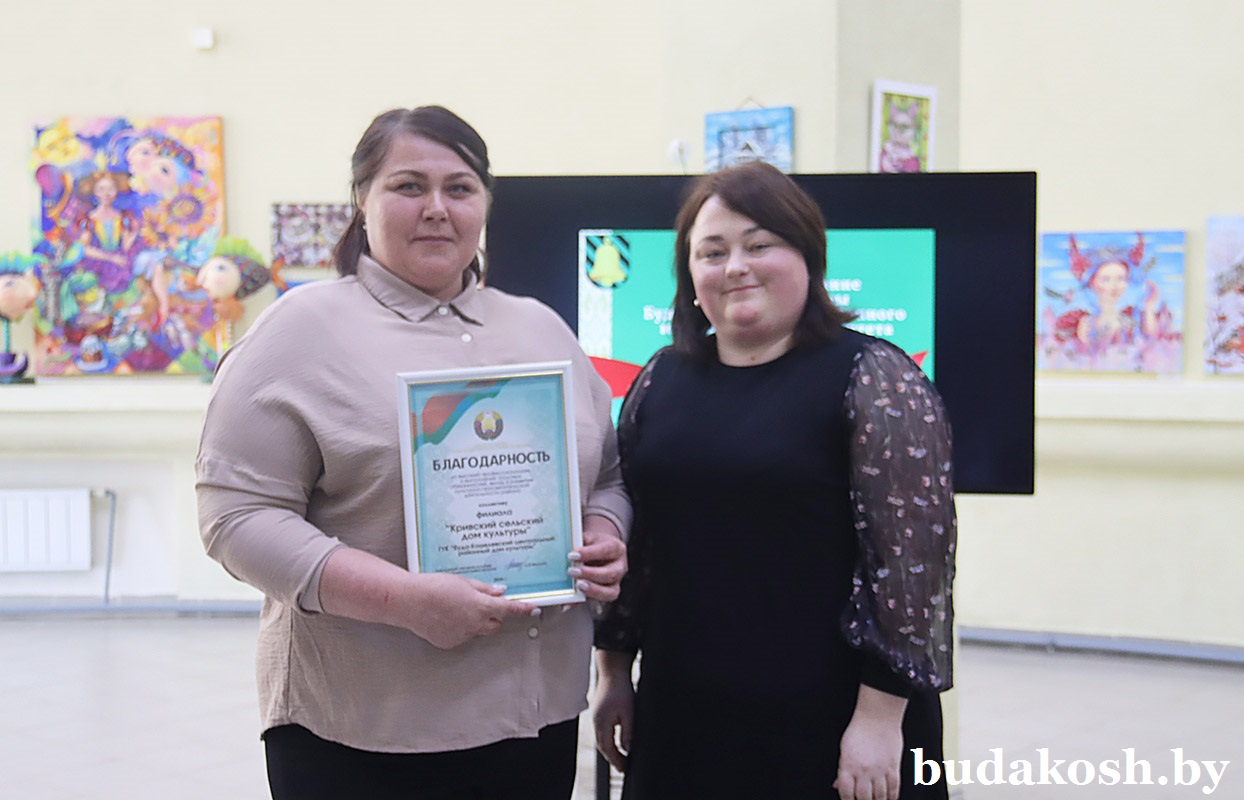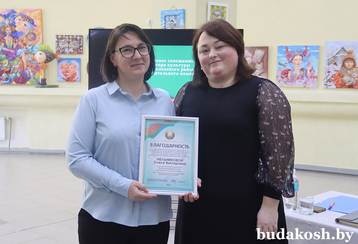 Благодарности сектора культуры объявлены: за добросовестный труд, высокий профессиональный уровень, особый вклад в сохранение, развитие и популяризацию культуры, активное участие в культурных мероприятиях и общественной жизни района – заведующей Бацунским СДК Ольге Шавыровой и культорганизатору Краснознаменского СДК Олесе Мельниковой; за высокий профессионализм и выполнение трудовых обязанностей, вклад в развитие культурно-просветительской деятельности района – коллективам Уваровичского ГДК, Коммунаровского ДК, Чеботовичского ЦНТ и Кривского СДК.