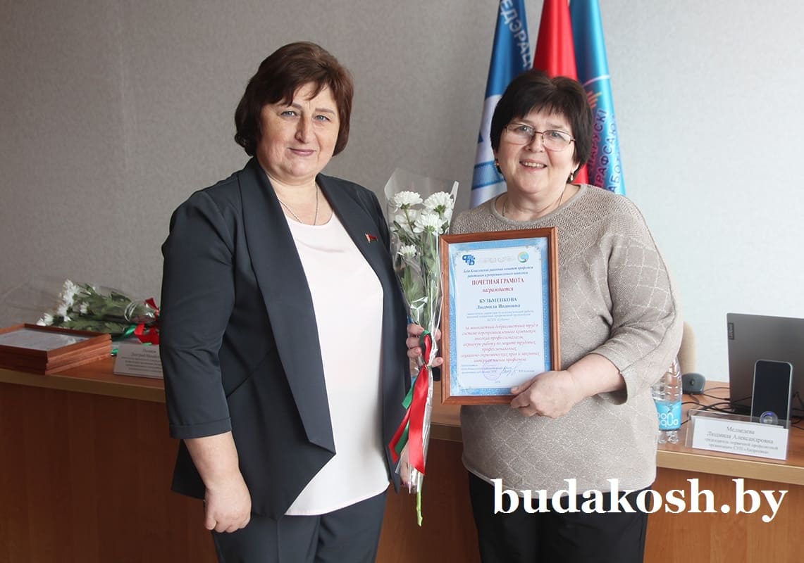Завершилось мероприятие вручением наград. За многолетний добросовестный труд в системе агропромышленного комплекса, высокий профессионализм, активную работу по защите трудовых, профессиональных, социально-экономических прав и законных интересов членов профсоюза Валентина Ксензова вручила Почетную грамоту районного комитета профсоюза работников агропромышленного комплекса казначею первичной профсоюзной организации КСУП «Губичи» Людмиле Кузьменковой, объявила благодарности председателям первичных профсоюзных организаций – Инне Благодеровой (СП «АМИПАК»-ОАО), Екатерине Вишняковой (СУП «Морозовичи-Агро»), Светлане Харитоненко (ОАО «Буда-Кошелево-агросервис»), казначеям первичек Татьяне Здольниковой (ОАО «Николаевка»), Алесе Кириленко (управление сельского хозяйства и продовольствия райисполкома). За многолетний добросовестный труд в системе агропромышленного комплекса, высокий профессионализм, активное участие в общественной и профсоюзной жизни коллектива благодарность райкома профсоюза работников АПК объявлена члену профсоюза Елене Ляховой (ОАО «Николаевка»).
